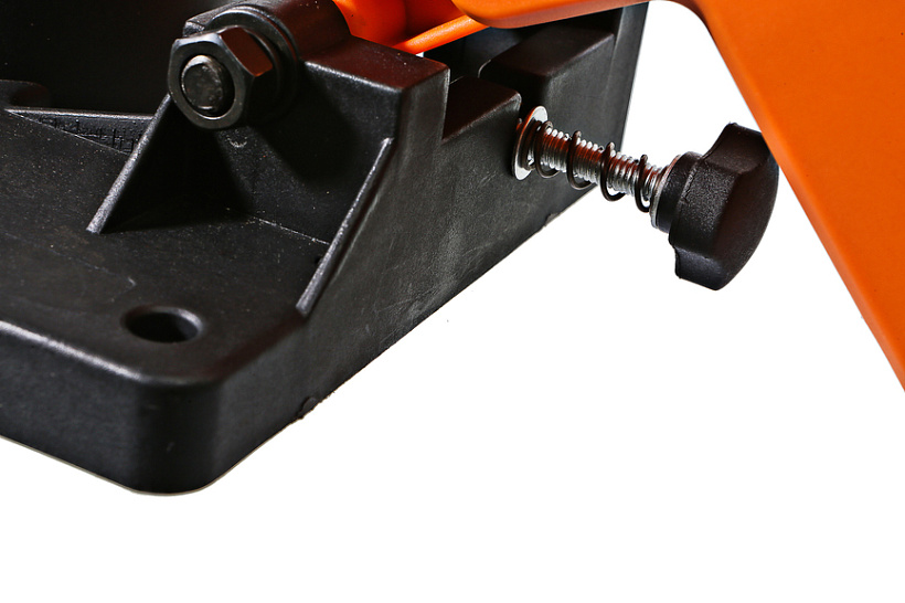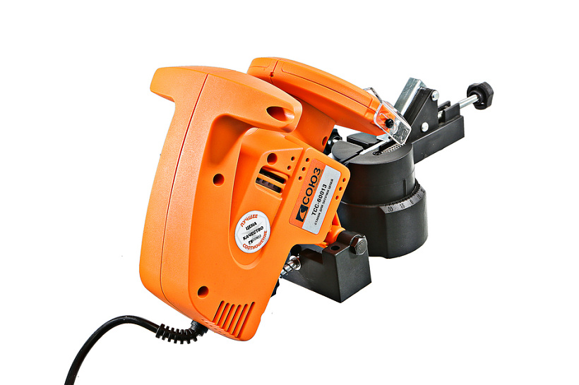 Для большей безопасности во время заточки в модели применена винтовая и клиновая фиксация обрабатываемого элемента, препятствующая его смещению и выскальзыванию из рабочего ручейка. Прижимной механизм обеспечивает точность зажима зубьев цепи под требуемым углом к рабочей поверхности абразивного диска для получения правильной конфигурации режущих плоскостей.