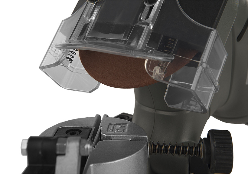 Защитный кожух, закрывающий абразивный диск для большей безопасности, устойчив к поверхностному воздействию отлетающих при заточке стальных опилок и абразивной пыли. Прозрачный полимерный экран помогает безопасно контролировать рабочий процесс и защищает оператора от вылета мелких частиц,