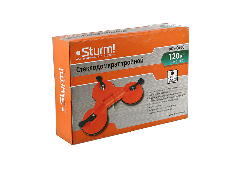 Стеклодомкрат используется для монтажа и транспортировки стекольных изделий, а также любых других грузов, имеющих гладкую и ровную поверхность. Он состоит из корпуса-ручки и из установленной в нём резиновой диафрагмы, работающей по принципу резиновой вакуумной «присоски». Корпус инструмента изготовлен из ударопрочного пластика. Грузоподъемность стеклодомкрата до 120 кг.