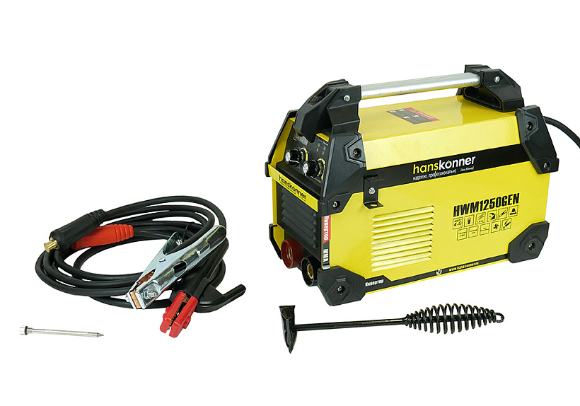 Сварочный инвертор Hanskonner HWM1250GEN. Однофазный, переносной, вентилируемый инвертор для ручной сварки со всеми видами электродов, простым управлением и универсальным подключением.
