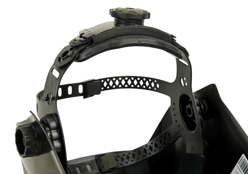 Щиток оснащен удобной крепежной 3D системой с простой настройкой под любой размер головы. Для точной подгонки наголовной ленты применен поворотный механизм с автофиксацией, а комфортное положение маски по высоте можно предварительно выставить с помощью реечного пошагового механизма. Ручка фиксации щитка для удобства имеет крупную насечку, позволяя пользователю выполнить быстрый зажим, не снимая сварочных рукавиц.