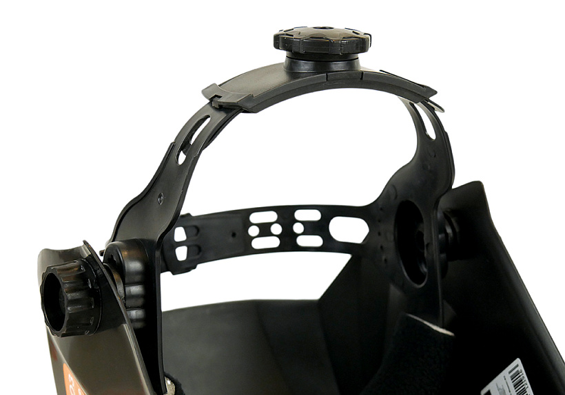 Щиток оснащен удобной крепежной 3D системой с простой настройкой под любой размер головы. Для точной подгонки наголовной ленты применен поворотный механизм с автофиксацией, а комфортное положение маски по высоте можно предварительно выставить с помощью реечного пошагового механизма. Ручка фиксации щитка для удобства имеет крупную насечку, позволяя пользователю выполнить быстрый зажим, не снимая сварочных рукавиц.