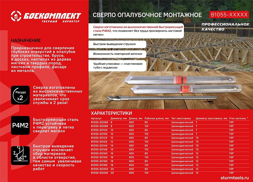 Предназначено для сверления глубоких отверстий в опалубке при строительстве, брусе, в досках, настилах из дерева мягких и твердых пород, листовом профиле, фасаде из металла.