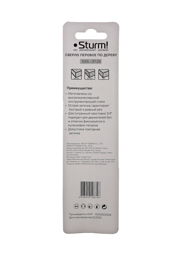 Сверло перовое по дереву, 24мм, шестигранный хвостовик, Sturm!