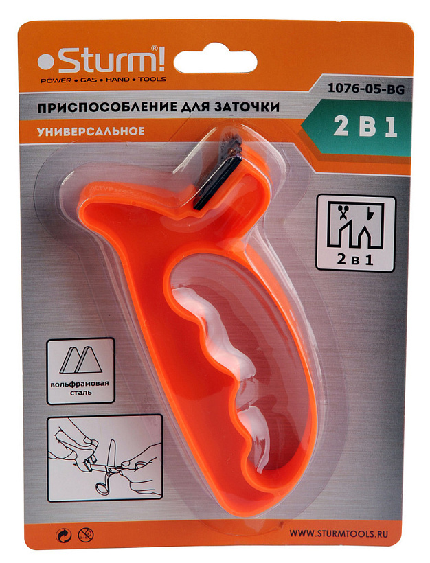 Устройство для заточки ножей Sturm! 1076-05-BG с эргономичной рукоятью и антискользящим покрытием. Представляет из себя приспособление с двухкомпонентным корпусом, защитой от соскальзывания и резцами из вольфрамовой стали. 2 в 1: заточка как ножей, так и ножниц.