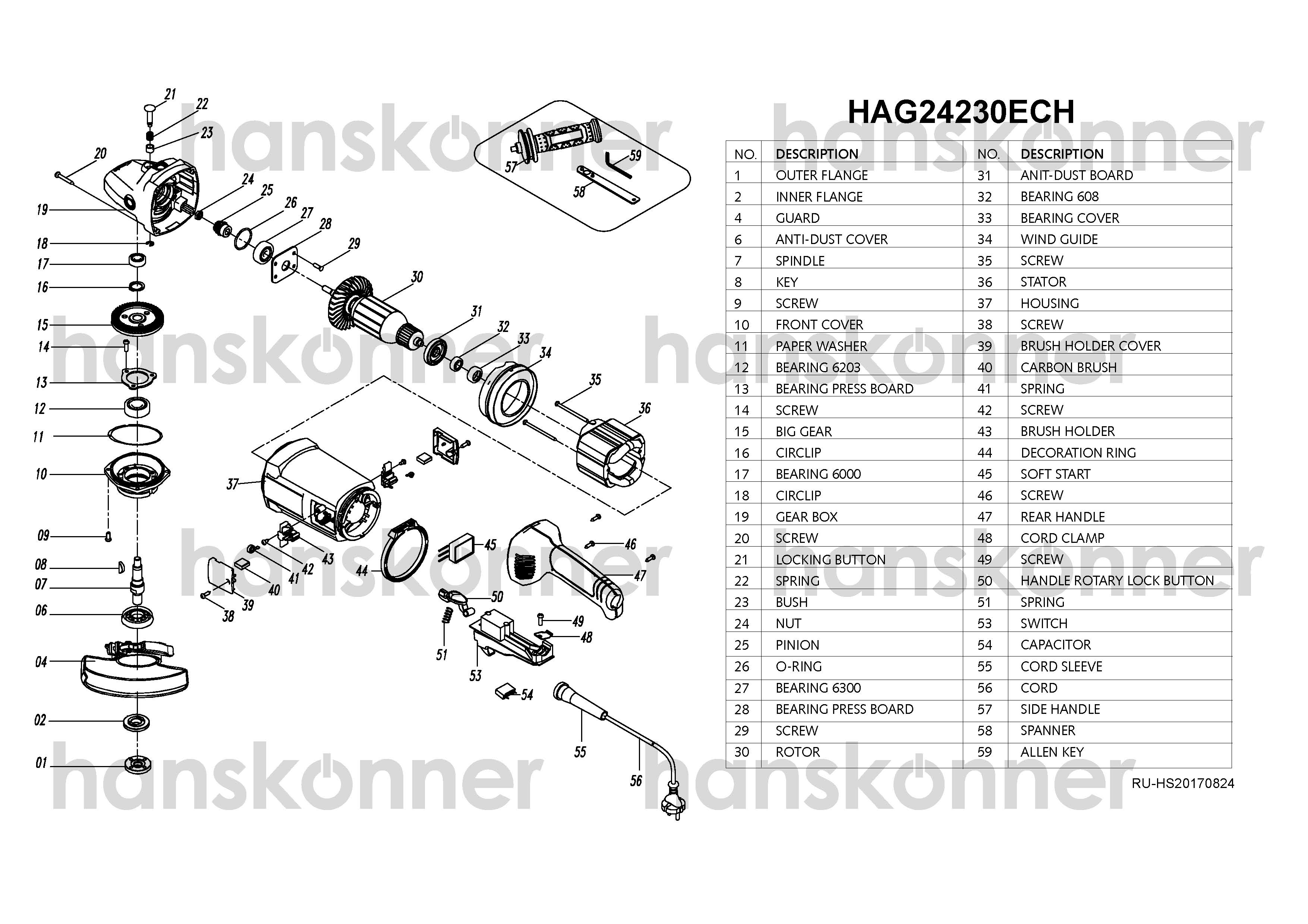 Угловая шлифовальная машина Быстросъемный защитный кожух Боковая рукоятка Фланцевый ключ Шестигранный ключ Инструкция по эксплуатации