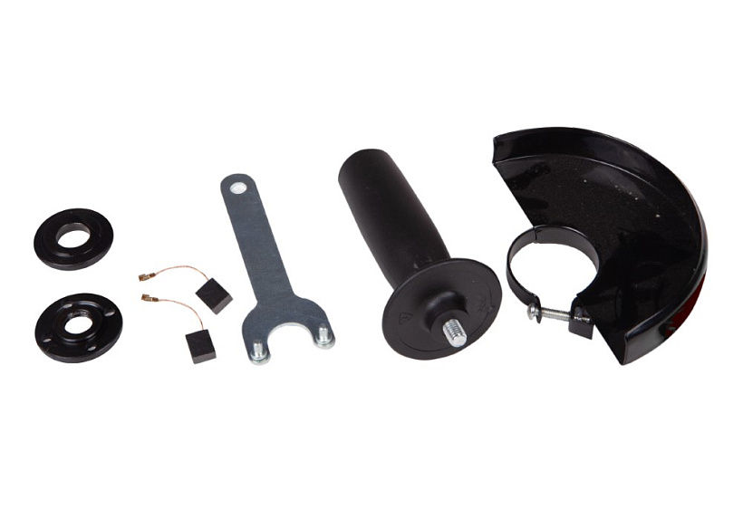 Гайки для крепления диска, комплект щеток, дополнительная рукоятка, ключ, защитный кожух в комплекте.