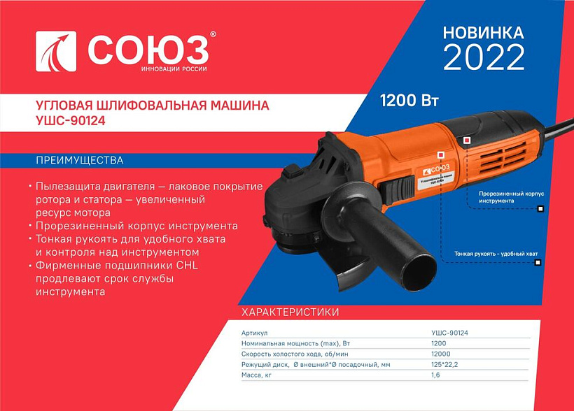 СОЮЗ УШС-90124 – компактная универсальная болгарка (УШМ) бытового назначения под рабочий диаметр диска 125 мм. Модель обладает оптимальными массово-габаритными показателями и выверенными пропорциями: малый диаметр корпуса и обилие прорезиненных поверхностей обеспечивают максимальное удобство хвата, нейтральный центр тяжести позволяет уверенно контролировать инструмент в процессе работы даже одной рукой, низкопрофильный корпус редуктора клиновидной формы облегчает работу в местах с трудным доступом. Инструмент оснащен мощным 1200 Вт электромотором со специальным термостойким покрытием, усиленным редуктором, а также качественными пылезащищенными подшипниками – все это гарантирует достаточный запас по надежности. Кроме того, применение шестерен с конической формой зуба способствует низкому уровню шума при работе. Модель проста в эксплуатации и обслуживании. В комплектацию к инструменту входят дополнительная рукоять, ключ для смены оснастки и комплект запасных щеток.