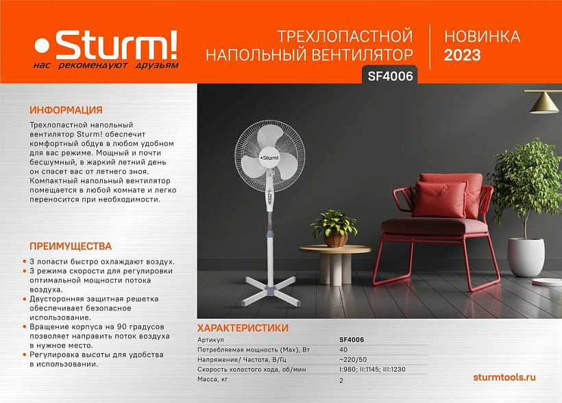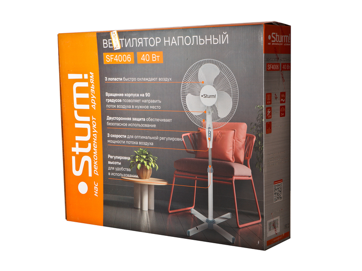 Вентилятор Sturm! обеспечит комфортный обдув в любом удобном для вас режиме. Мощный и почти бесшумный, в жаркий летний день он спасет вас от летнего зноя. Компактный напольный вентилятор помещается в любой комнате и легко переносится при необходимости.