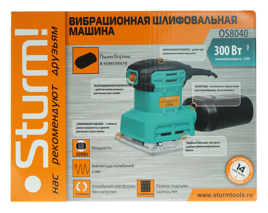 * Удобное управление одной рукой * Жесткий пылесборник для сбора отходов * Надежные зажимы для крепления шлифлистов * Малый вес Sturm OS8040 для неутомительной работы * Основная рукоятка с антискользящей накладкой для надежного захвата