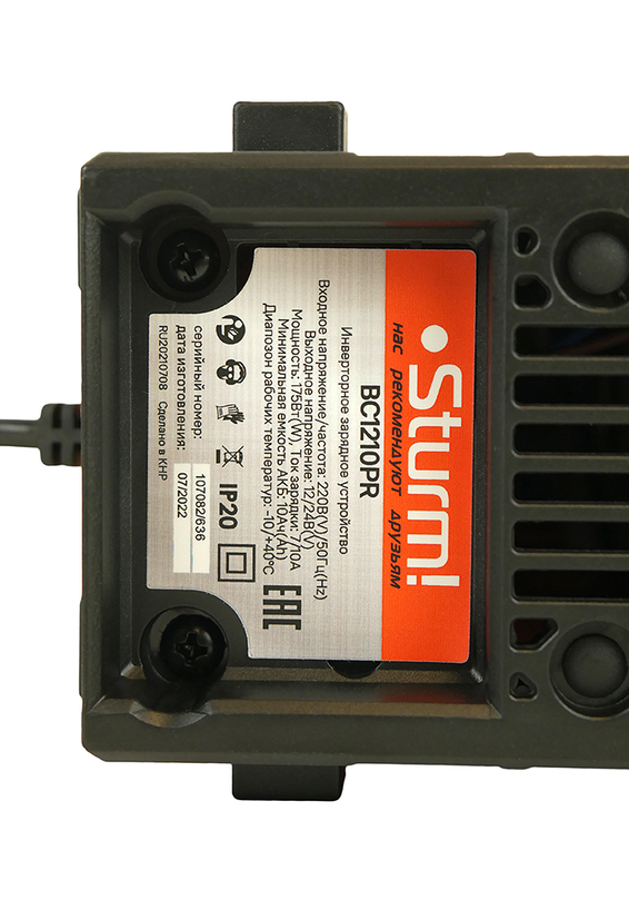 Sturm BC1210PR — современное универсальное автоматическое инверторное зарядное устройство. Предназначено для быстрой и эффективной зарядки практически любых видов аккумуляторных батарей (WET /AGM /GEL /EFB), напряжением 12 или 24 Вольта, емкостью от 10 до 100 Ач. Идентификация вида заряжаемого аккумулятора производится автоматически. Модель обладает небольшими габаритными размерами и массой, а также имеет металлический, стойкий к возможным механическим повреждениям, корпус — является оптимальным вариантом переносного высокомобильного устройства, максимально удобного при транспортировке и хранении. Прибор прост в эксплуатации и не вызовет трудностей в освоении. Удобство использования обеспечивает наличие большого дисплея, на который выводится все необходимая текущая информация о ходе процесса зарядки. Важная особенность модели — наличие режима автоматической бережной многоэтапной зарядки — устройство автоматически подбирает необходимую силу тока и продолжительность процесса заряда. Также предусмотрена функция импульсного восстановления для сильно разряженных аккумуляторных батарей. Для обеспечения безопасности пользователя в случае любых внештатных ситуаций прибор оснащен необходимым комплексом защиты: от перегрева, от короткого замыкания, от неверной полярности подключения. В комплект поставки входит также ремень для удобства перемещения.